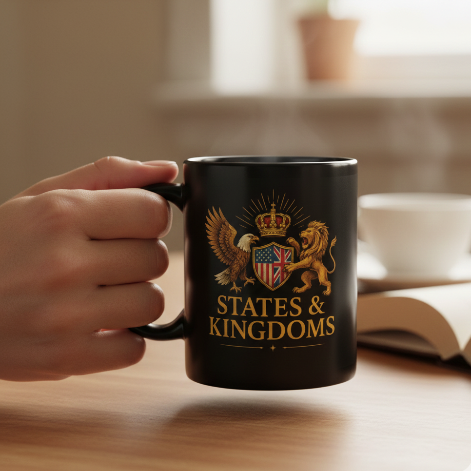 Start your morning with strength and symbolism. The States & Kingdoms Battle-Brew Mug unites the American eagle and British lion over crossed swords, creating a crest of grit and heritage. Durable ceramic, vivid color, and everyday convenience make this the perfect mug for patriots who lead with purpose.