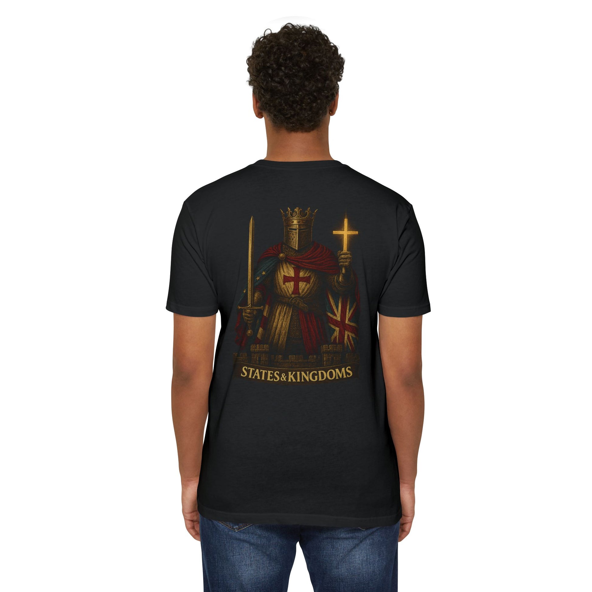Stand tall in defiance and unity with the Crusader of States & Kingdoms design. This powerful artwork features a crowned crusader knight, gripping a golden sword in one hand and a radiant cross in the other—symbols of strength, conviction, and unyielding faith. Draped in both the American Stars & Stripes and the British Union Jack, he embodies the unbreakable bond between two proud nations. With gritty detail, bold colors, and a stance that commands respect, this piece is perfect for patriots, history enthusiasts, and warriors at heart.