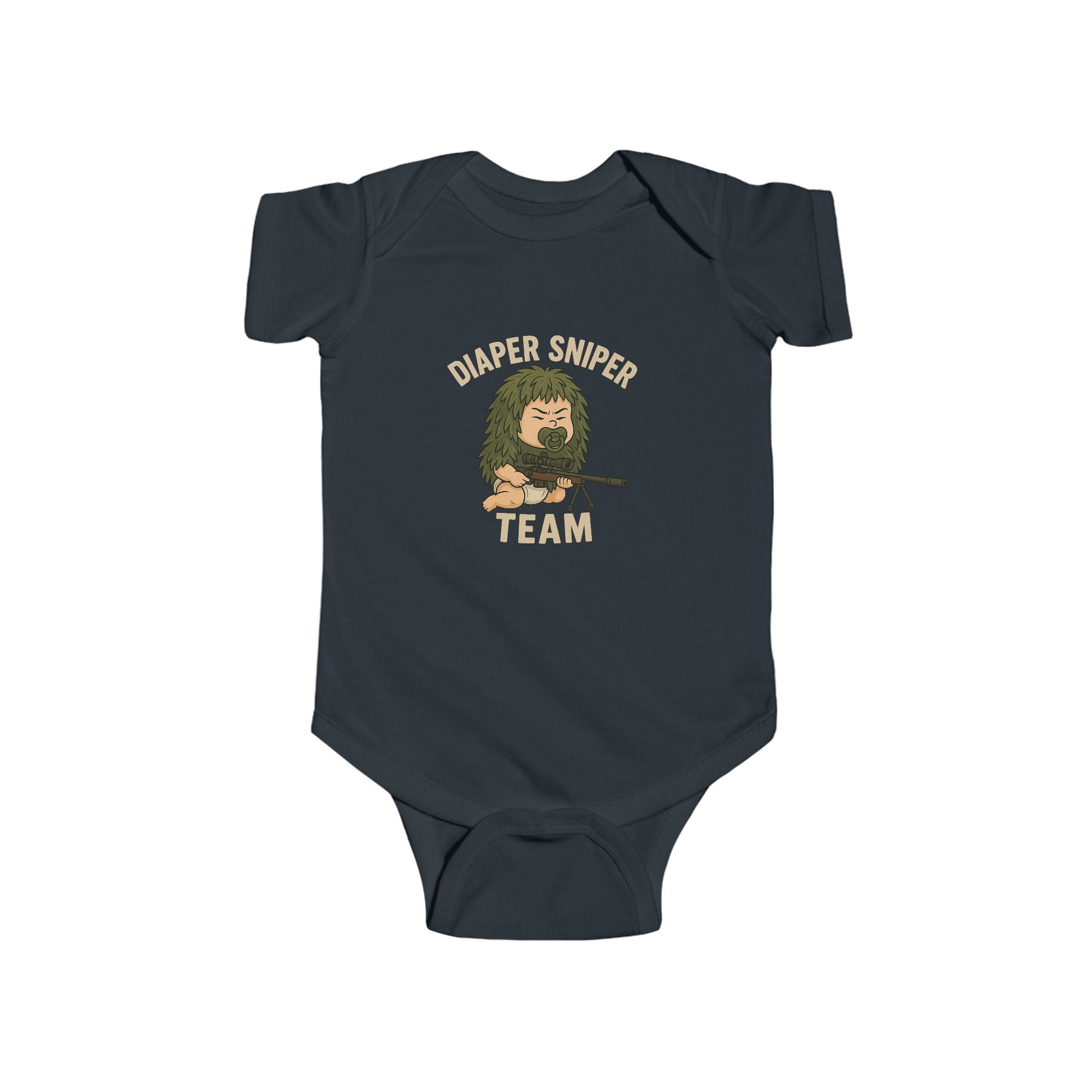 For the tiny operator who never misses nap time… or a target. This hilarious design features a baby decked out in a full ghillie suit, pacifier in place, and sniper rifle at the ready. Perfect for military families, veterans, and parents with a sense of humor. Soft, bold, and guaranteed to get a laugh every time your little one “goes tactical.”