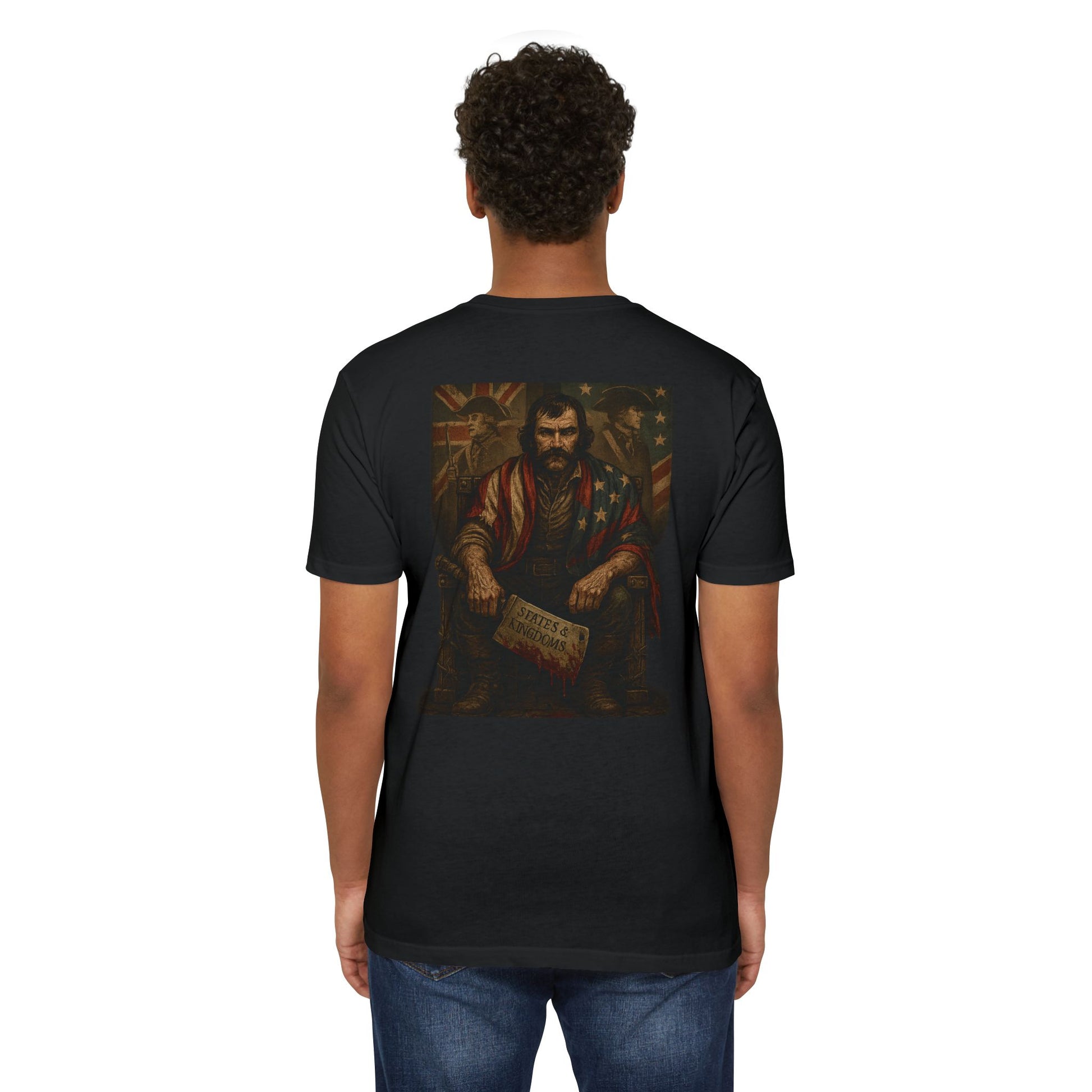Channel the ruthless charisma of Billy the Butcher from Gangs of New York in this exclusive States & Kingdoms design. This high-detail artwork captures a gritty, battle-hardened figure draped in the American flag, sitting on a throne of defiance, gripping a bloodied cleaver etched with “States & Kingdoms.” Behind him, the Union Jack and Stars & Stripes loom like the ghosts of history, honoring the shared bloodlines of two warrior nations.